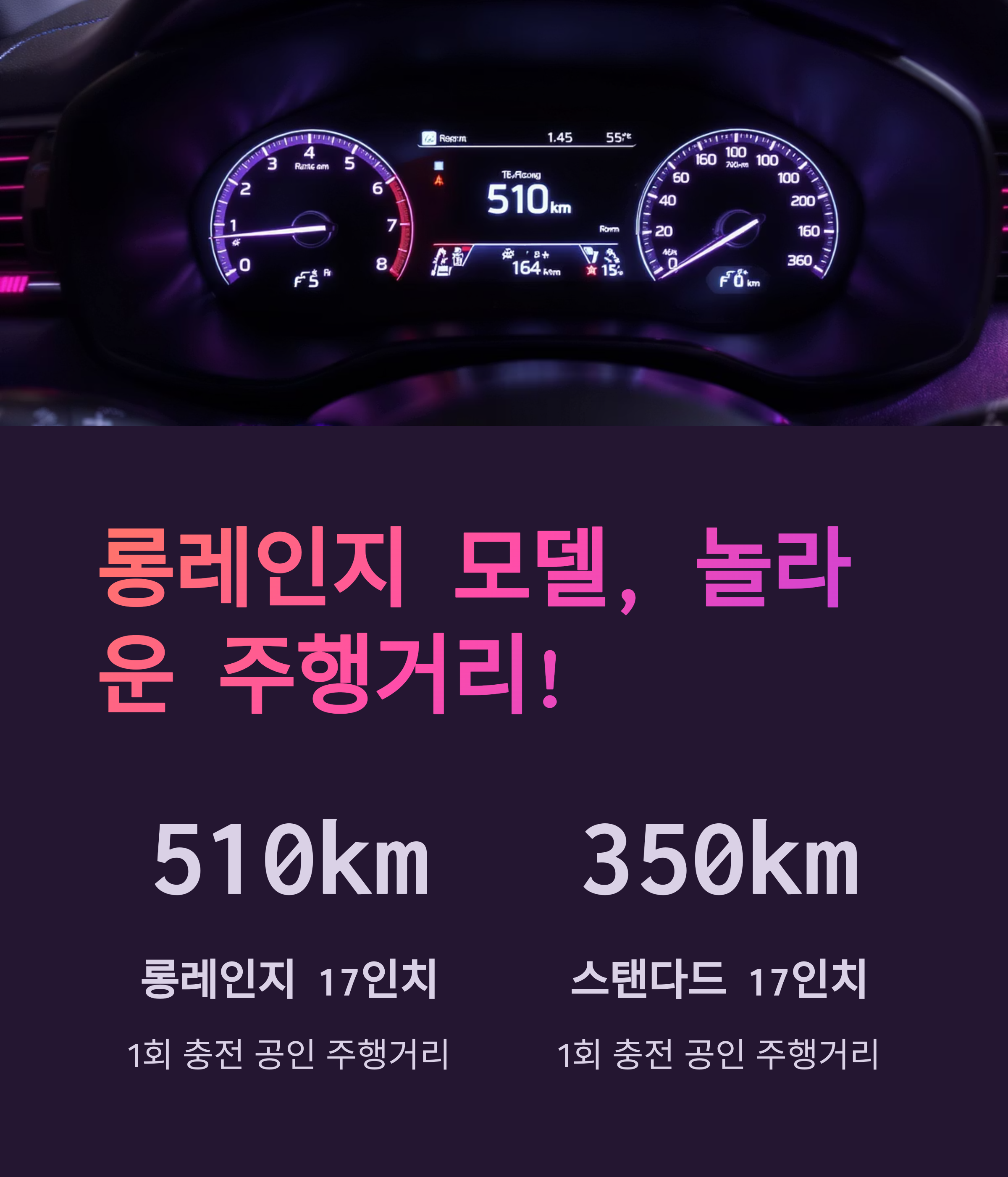특히 롱레인지 모델의 510km라는 주행거리는 장거리 운전에도 전혀 부담이 없을 정도랍니다.