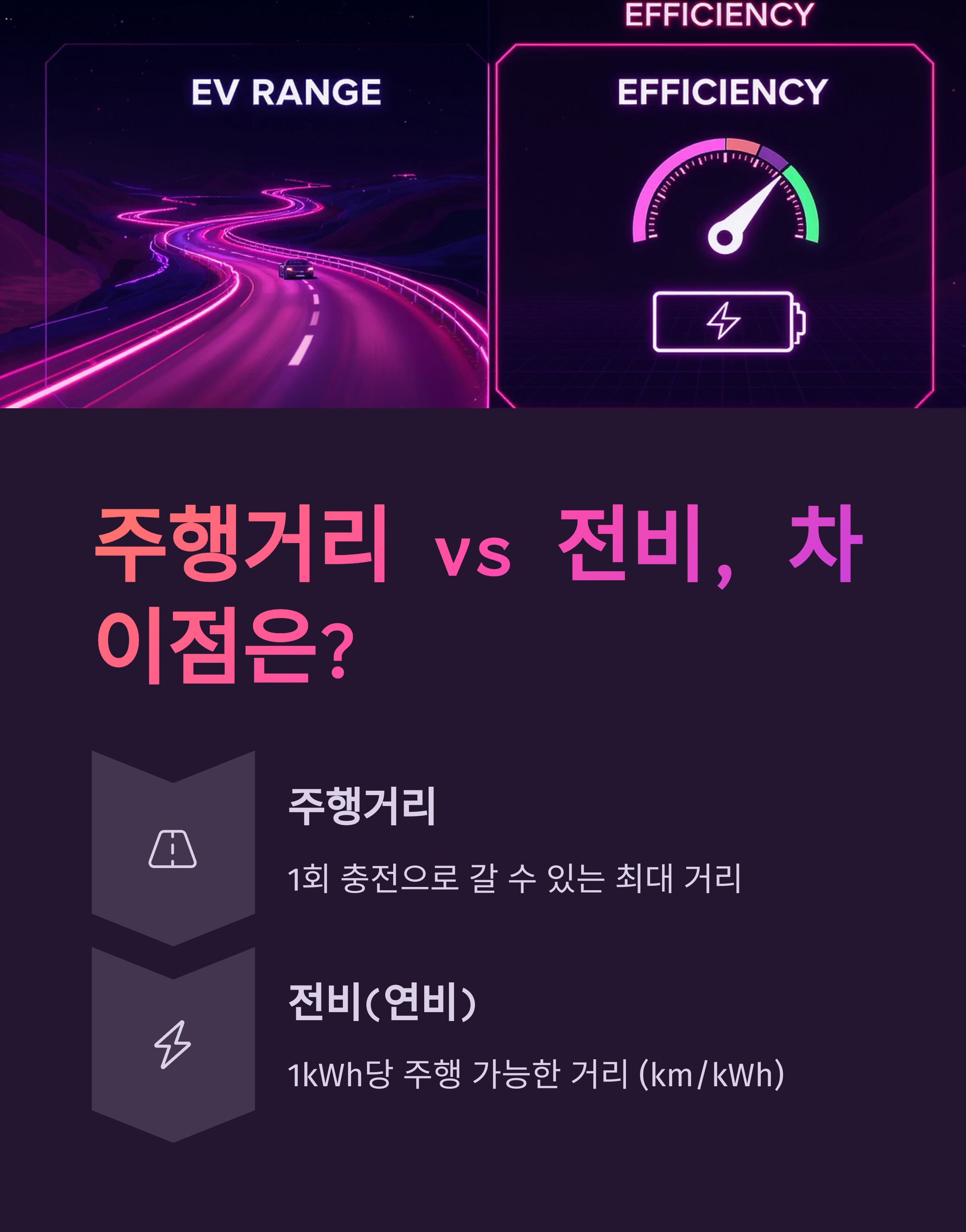 | 개념 | 1회 충전으로 갈 수 있는 최대 거리 | 1kWh 당 주행 가능한 거리 |