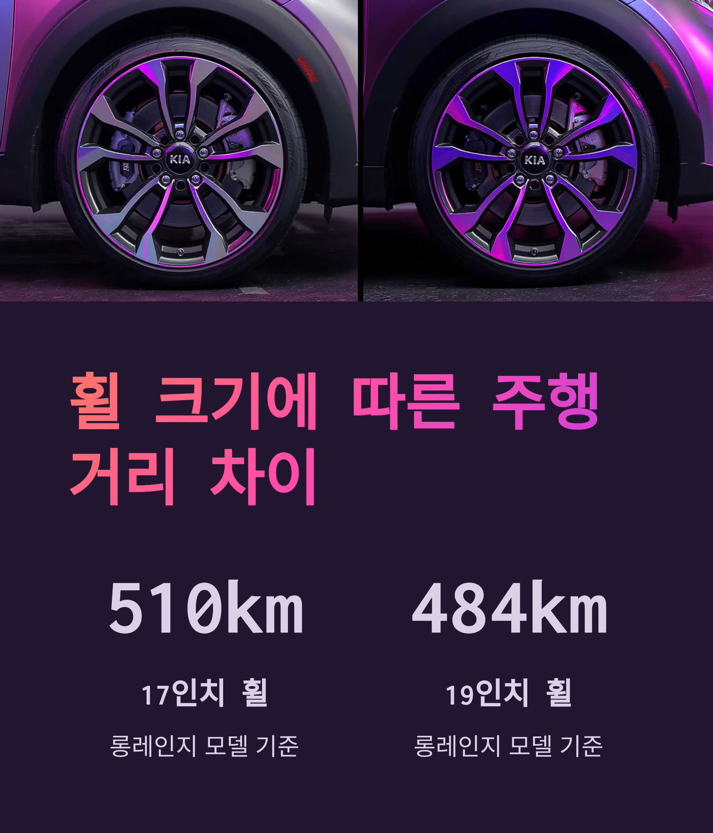 A5. 네, 영향을 미칩니다. 일반적으로 휠 크기가 커질수록 공기 저항과 회전 저항이 증가하여 전비가 낮아지고, 결과적으로 주행거리가 줄어들 수 있습니다. EV3 롱레인지 17인치 휠 모델은 510km이지만, 19인치 휠 모델은 484km로 주행거리가 다소 감소합니다.