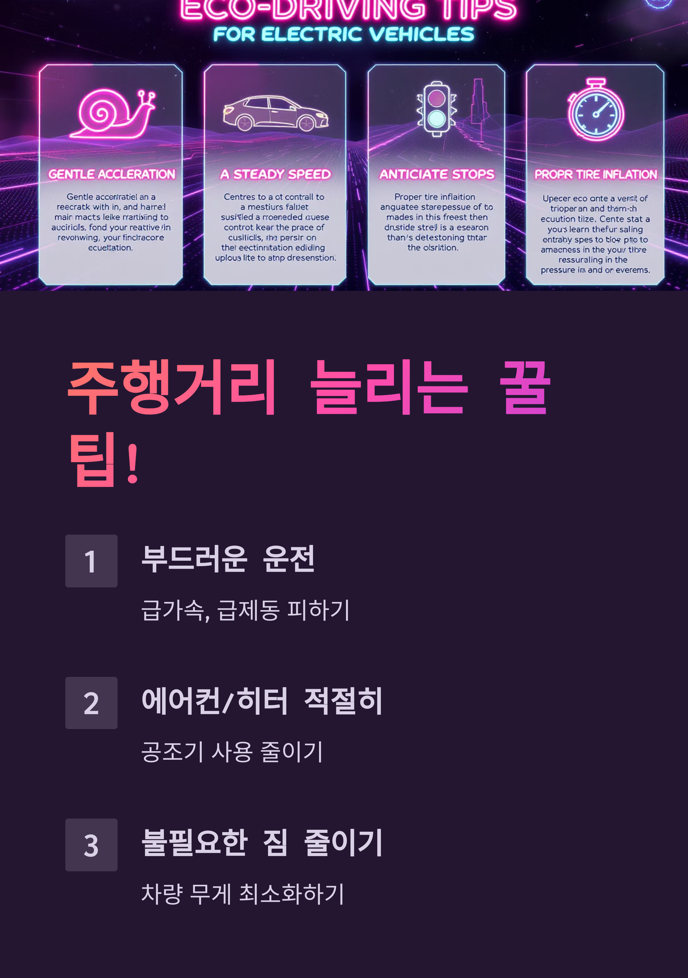 운전하는 사람의 습관도 정말 중요해요! 급가속, 급제동, 과속 등은 전비(연비)를 크게 떨어뜨려 1회 충전 주행거리를 줄이는 주범이랍니다.