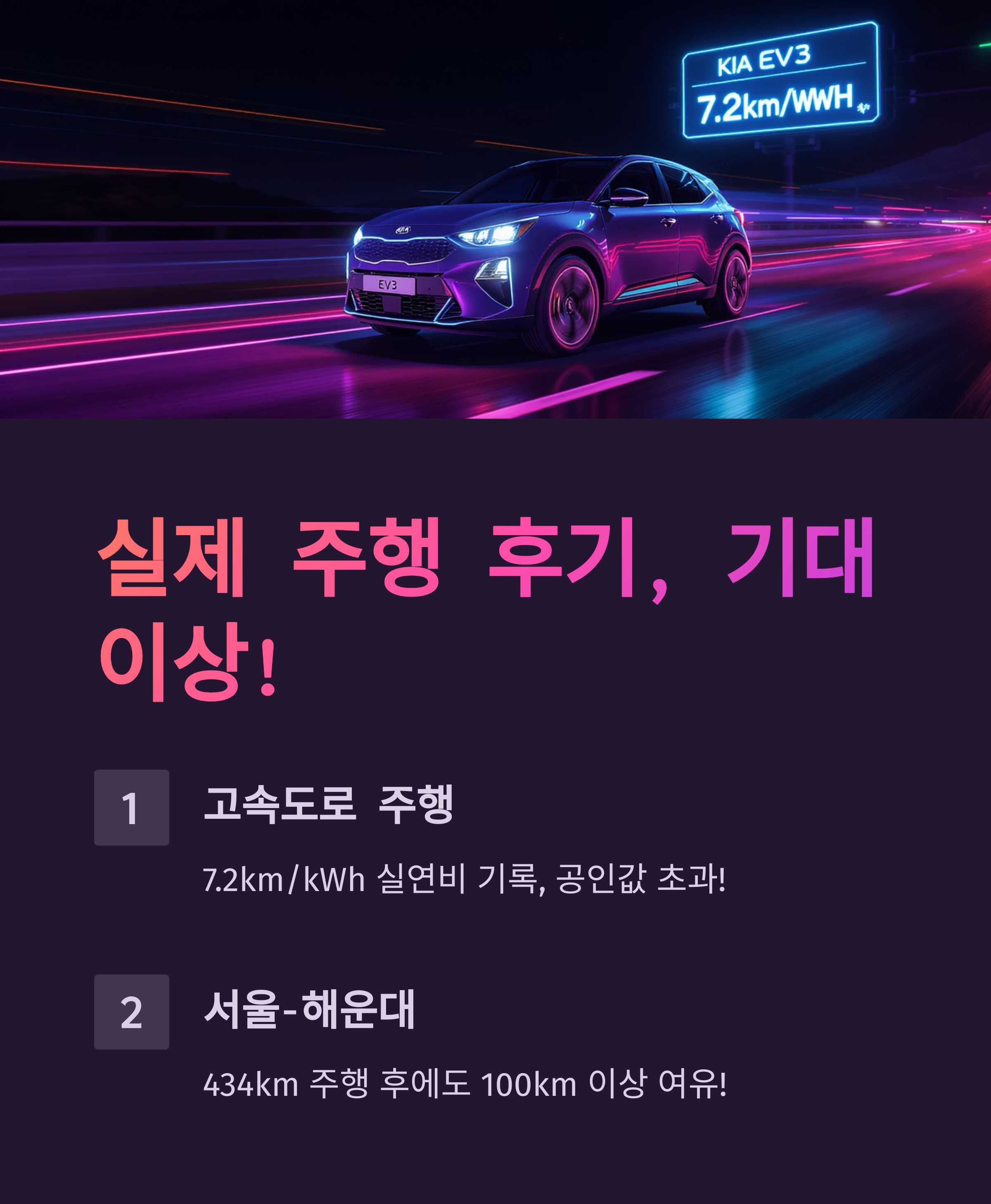 그래서 동일한 배터리 용량으로도 도심에서 더 먼 거리를 주행할 수 있답니다. 반면, 고속도로에서는 지속적인 고속 주행과 공기 저항 등으로 인해 효율이 떨어질 수 있어요. 하지만 실제 테스트에서는 고속도로 장거리 주행(에어컨 사용, 6월 무더위) 조건에서도 EV3 롱레인지가 7.0km/kWh의 뛰어난 전비를 기록하며 공인 복합 전비(5.4km/kWh)를 뛰어넘는 결과를 보여주기도 했어요.