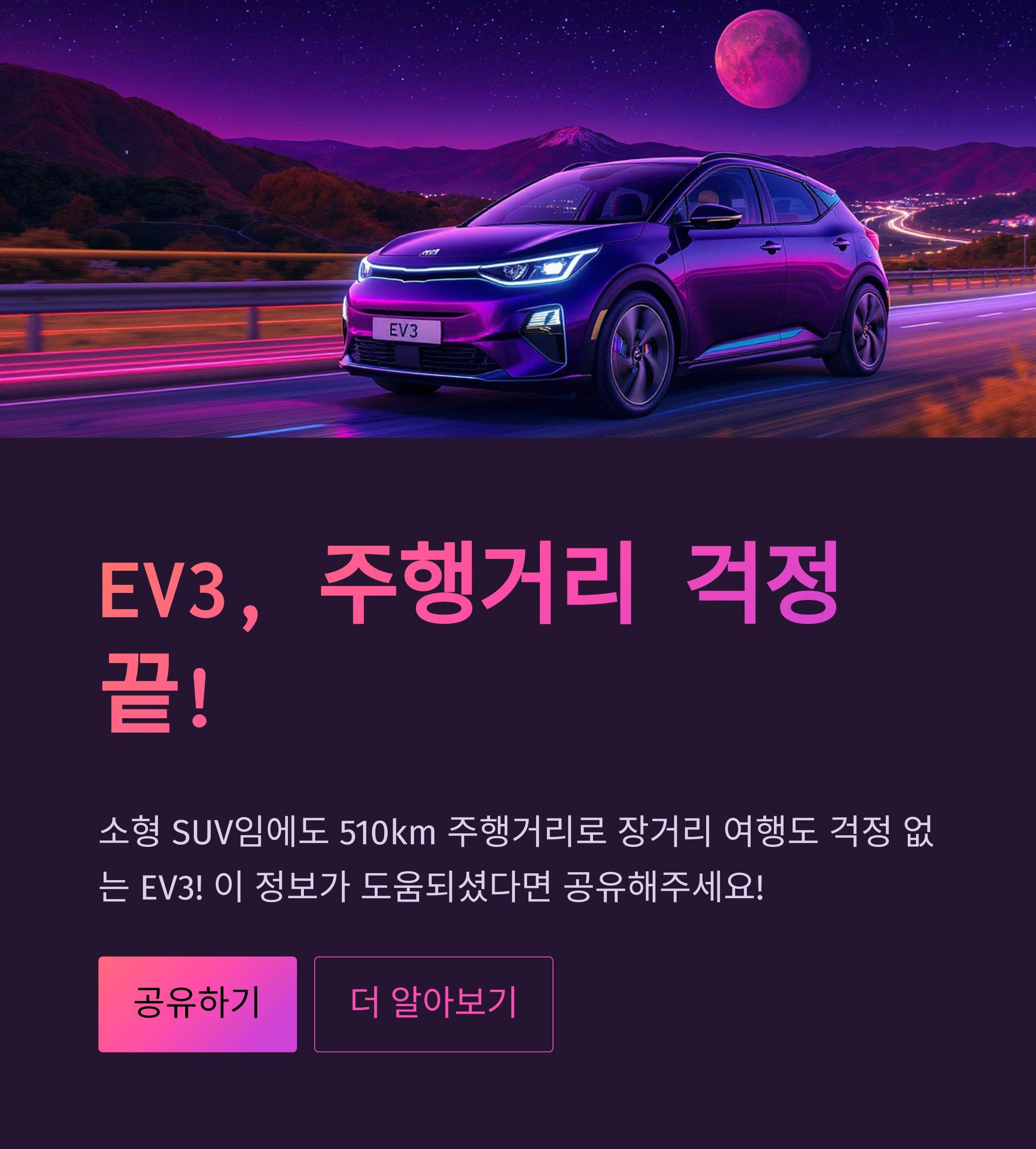 | EV3 롱레인지 | 약 501km(17인치 휠 기준) | 약 5.1~7.2km/kWh(실주행) |