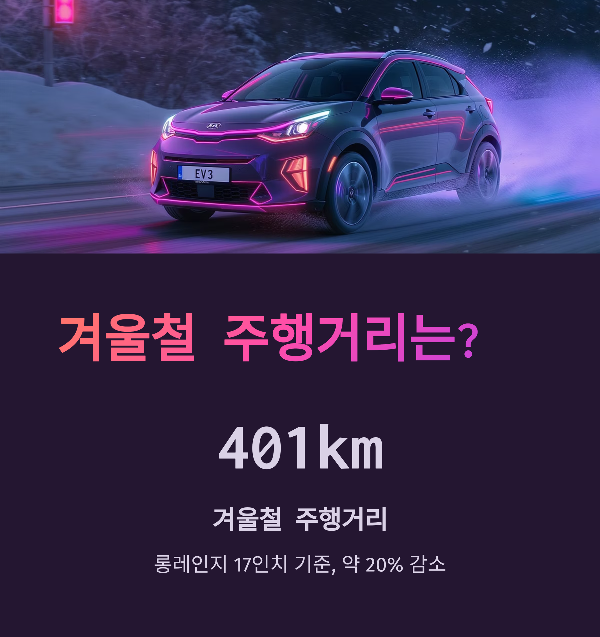 A3. 네, 겨울철에는 배터리 효율 저하와 히터 사용 등으로 인해 주행거리가 줄어들 수 있습니다. EV3 롱레인지 17인치 휠 모델의 경우 환경부 기준 저온 복합 주행거리는 401km로, 일반 환경 대비 약 20% 가까이 감소합니다. 하지만 여전히 400km 이상을 주행할 수 있어 일상적인 사용에는 큰 무리가 없습니다.