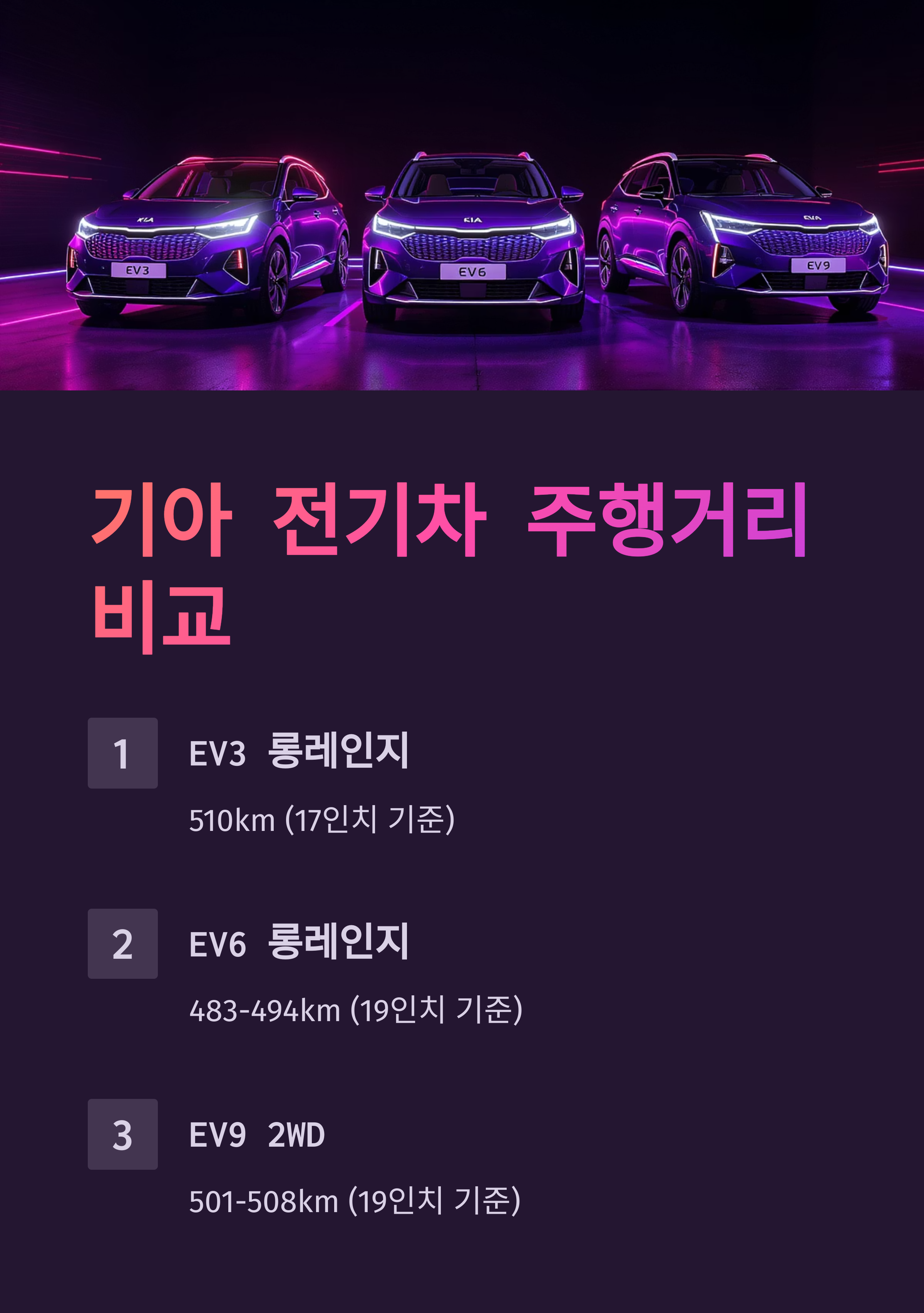 | EV3 롱레인지(17인치) | 510km | 도심 556km/고속 455km | 81.4kWh 배터리, 19인치: 484km |