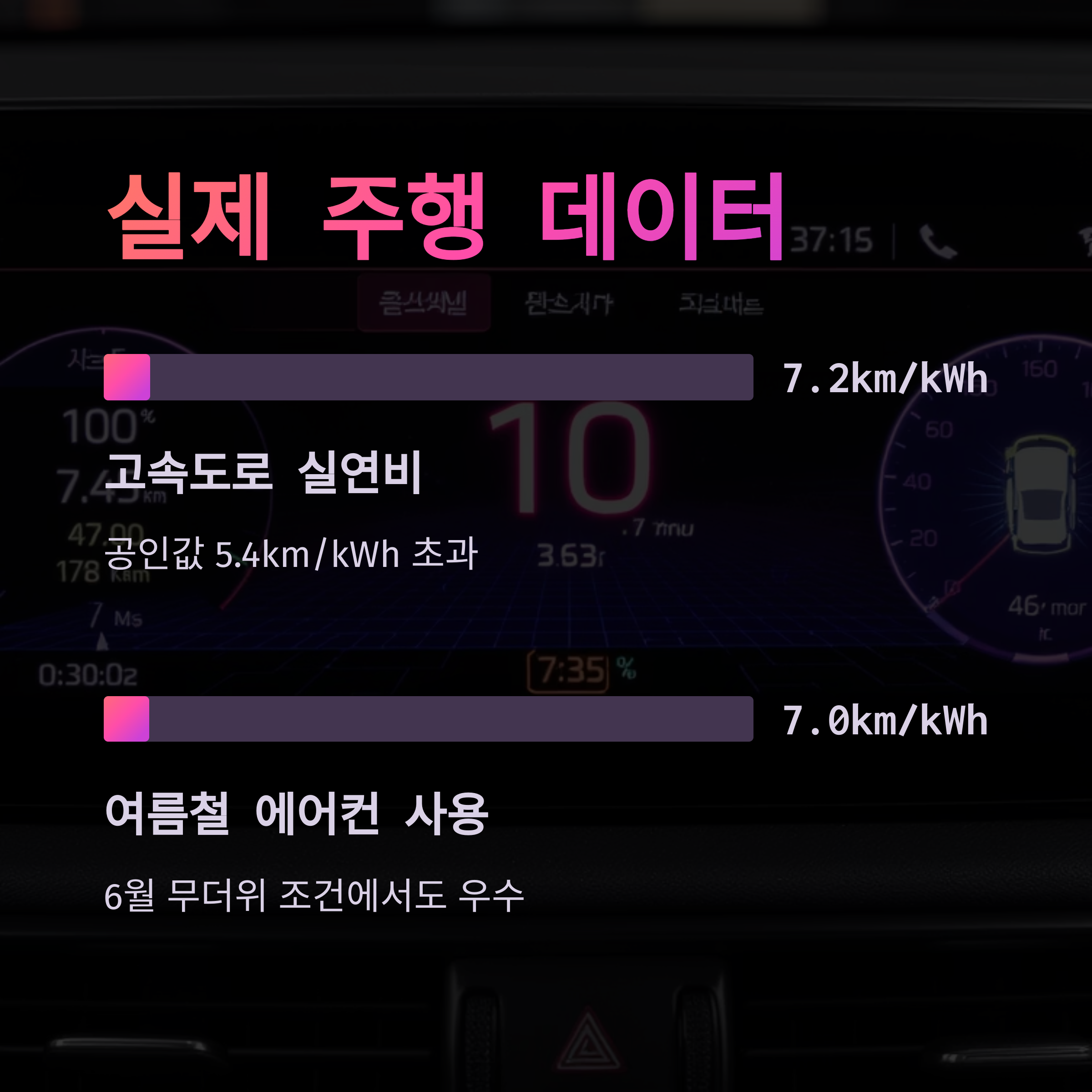 | 실제 고속도로 시승 (에어컨 22℃, 6월 무더위) | 434km 주행, 전비 7.0km/kWh (공인값 5.4km/kWh 초과) | - |